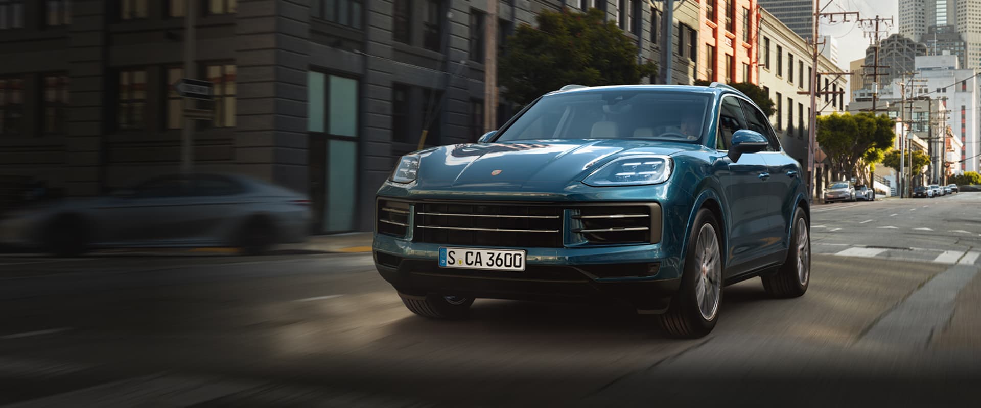 A Porsche Cayenne driving on an open road.A Porsche Cayenne driving on an open road.