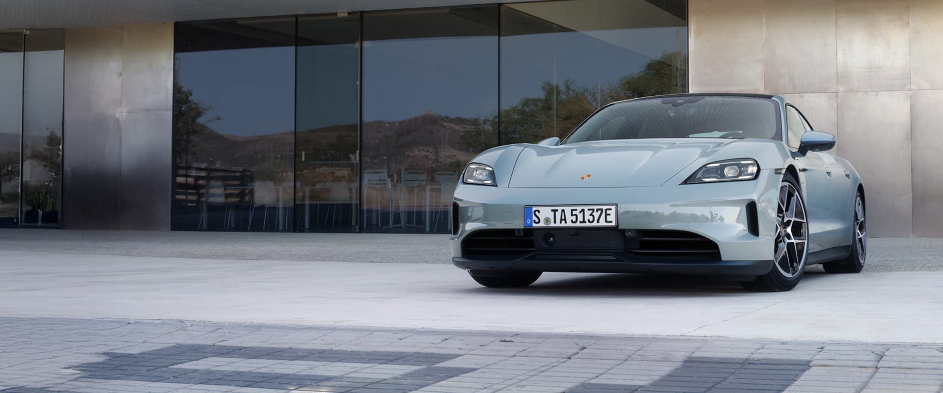 A Porsche Taycan parked outside in front of a modern building.A Porsche Taycan parked outside in front of a modern building.