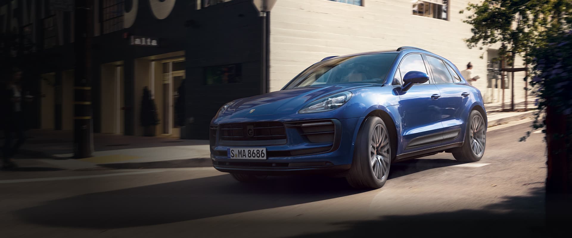 A Porsche all-electric Macan driving down a road in an urban scenario.A Porsche all-electric Macan driving down a road in an urban scenario.